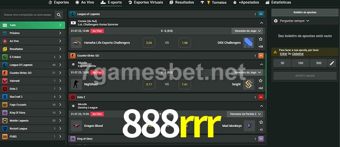 A 888rrr oferece uma seleção abrangente de opções de apostas em e-sports. Com uma ampla variedade de jogos para escolher, incluindo League of Legends, Dota 2 e CS:GO, há algo para todos os fãs de esportes eletrônicos. Além das apostas pré-jogo, a 888rrr também oferece opções de apostas ao vivo para muitos de seus eventos de e-sports. Portanto, seja você um novato em apostas em e-sports ou um profissional experiente, a 888rrr bet tem tudo o que você precisa para começar.